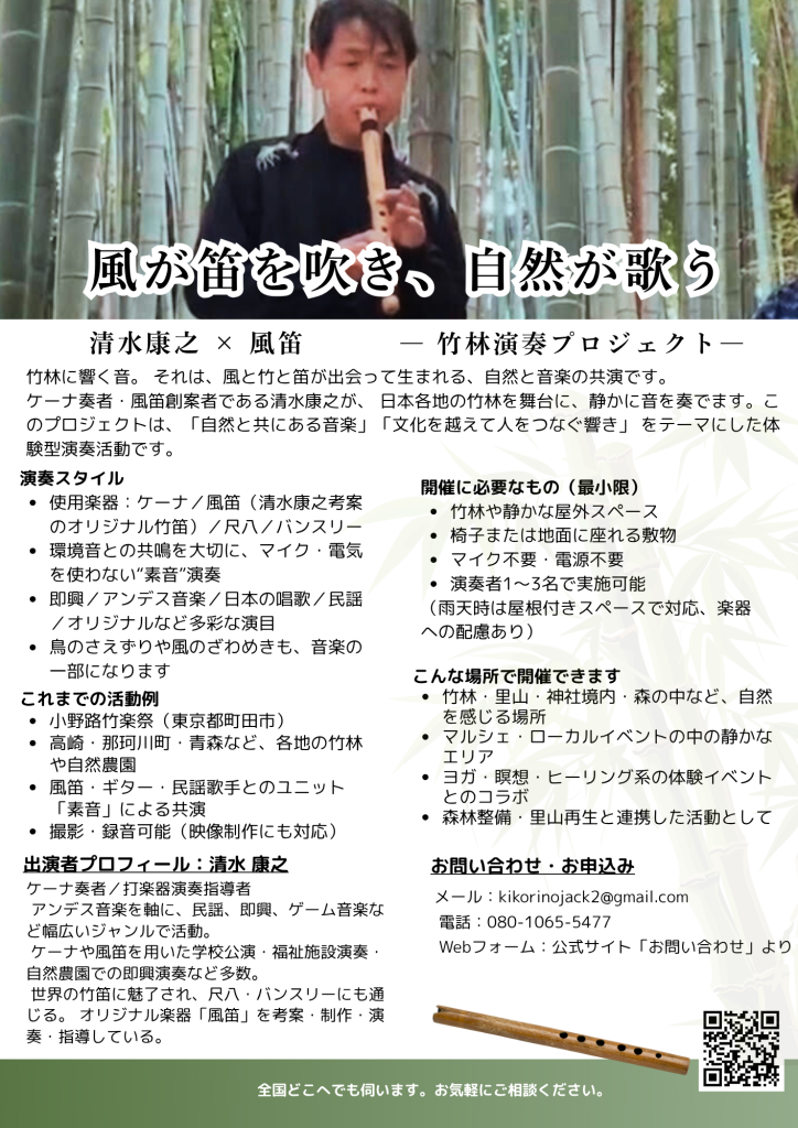 清水康之は、竹笛演奏を中心に、自然や食、瞑想、民謡、打楽器などと組み合わせたプログラムをご提供可能です。